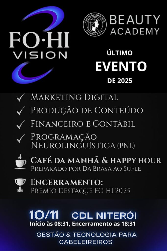 No dia 10 de novembro, Niterói será palco de um dos eventos mais aguardados do ano no setor de beleza: o Fo-Hi Vision. Promovido pela Fo-Hi Beauty Academy em parceria com aIntensive Treinamentos, o encontro reunirá especialistas em beleza, gestão e marketing digital em uma experiência única voltada ao aperfeiçoamento profissional e ao fortalecimento de negócios no segmento.