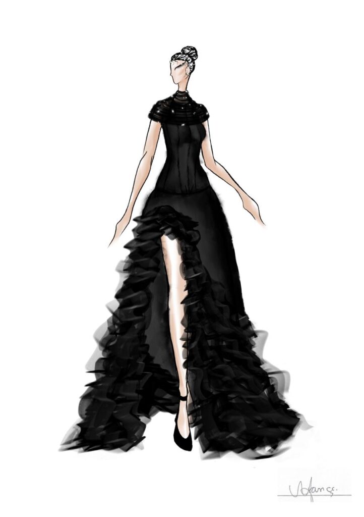 O tule preto representa a essência humana, pura, livre e feita de luz. O corpete estruturado simboliza a formação do ser, o processo de se moldar com o tempo e de despertar para a consciência. Já a fenda da saia, adornada por camadas de tule em movimento, traduz o fluxo da vida, com seus caminhos, pausas e recomeços.