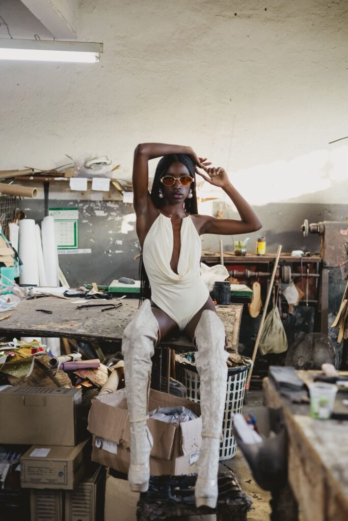 Para compor os looks do editorial, as modelos vestiram peças da marca de beachwear Sousolaire, que participou da produção trazendo suas criações para o ensaio realizado na oficina do artesão. A presença da marca reforça o diálogo entre diferentes expressões da moda brasileira — do artesanato tradicional à moda contemporânea — proposta central do projeto. Os acessórios de óculos foram assinados pela marca Talycheers, complementando o styling das produções.
