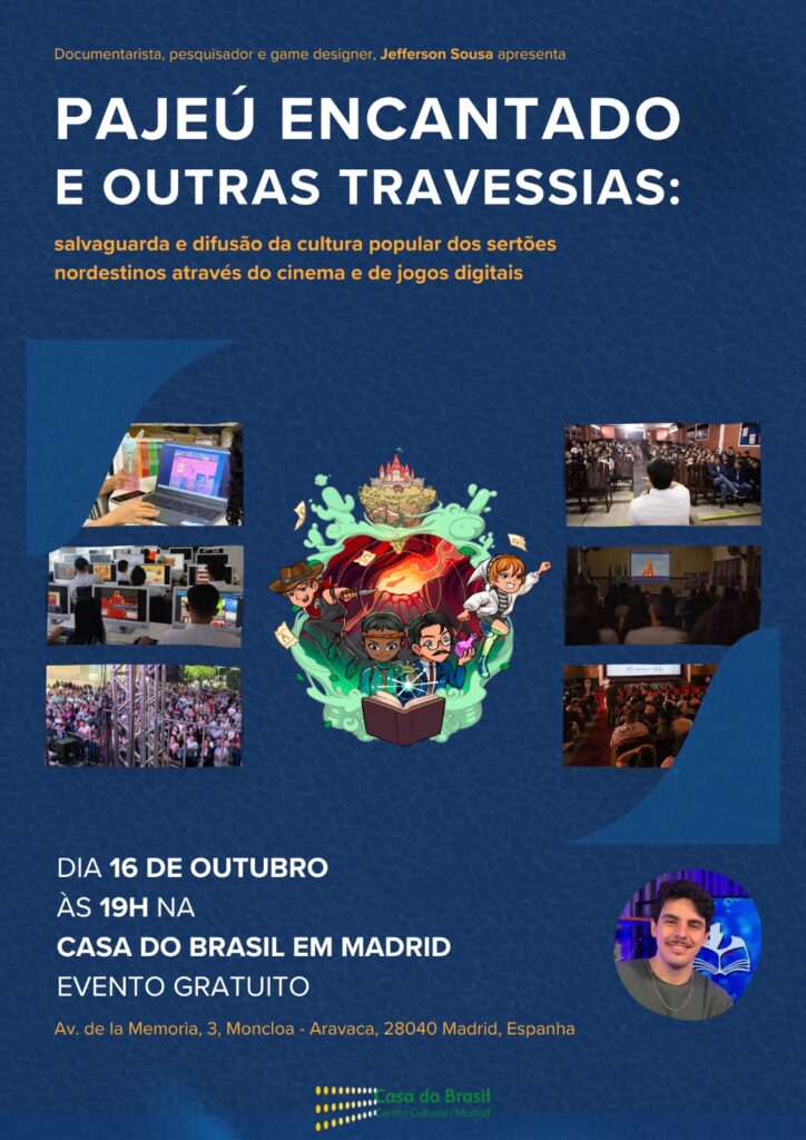 El miércoles 16 de octubre, la Casa de Brasil en Madrid recibe al periodista, documentalista y magíster en Letras (Estudios Literarios) por la Universidad Federal de Pernambuco, Jefferson Sousa, para la clase-conferencia “Pajeú Encantado y otras travesías: salvaguarda y difusión de la cultura popular de los sertones del nordeste brasileño a través del cine y de los videojuegos”.