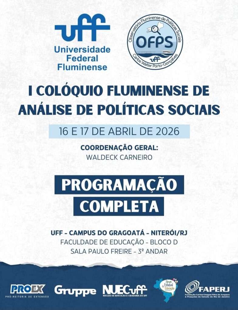 O Observatório Fluminense de Políticas Sociais “Carlos Walter Porto-Gonçalves” (OFPS), ligado ao Núcleo de Educação e Cidadania da Universidade Federal Fluminense (NUEC-UFF), coordenado por Waldeck Carneiro, professor titular da UFF, promove nesta quinta e sexta-feiras (16 e 17/04) 1º Colóquio Fluminense de Análise de Políticas Sociais (COFLAPS), aberto ao público. Os debates recairão sobre o processo de implementação de políticas públicas federais no Rio de Janeiro, objeto de monitoramento do Observatório, em diferentes áreas, como educação, direitos humanos, cultura, entre outras.